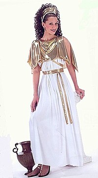 A white polyester dress with an attached nude Lycra bra. Polyster gold foil drape and ties. Matching headpiece included.