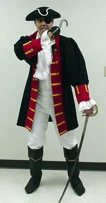 White pants, shirt and ascot, red jacket, black belt, boot covers & hat