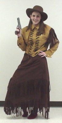Dark brown suede skirt with fringe, light brown suede jacket, & suede hat