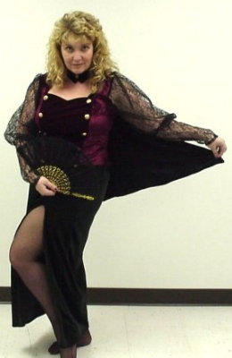 Blouse with lace sleeves, burgundy skirt & reversable caplet