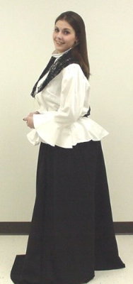 Black full skirt, white long sleeve blouse with high collar, black lace shawl, bustle & white ruffled sash