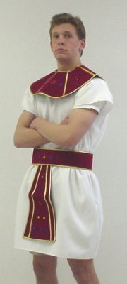 White dress, red jewelled collar & belt