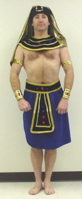 Blue skirt, black headpiece with gold lame, black and gold neckpiece and belt with jewels