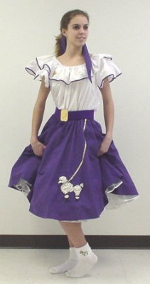 Crinolin, scarf, blouse, socks, belt, pin, & skirt with poodle