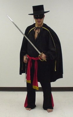 Black pants with red insert, black shirt, mask, cape, red sash, and hat