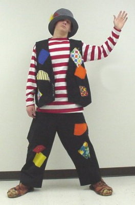 Black vest and pants with patches, shirt and grey hat with patches
